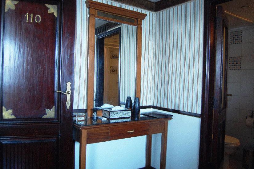 The Owner’s suite is fully air-conditioned and spans the full width of the rear of the ship. The suite is measuring 23.37m2 with a beautiful Lounge that opens onto its own private terrace which affords panoramic views of the Nile, perfect for entertaining or “when you just want to be alone”. The Suite boasts Egyptian cotton bedding, telephone with ample wardrobe and drawer space. The bathrooms are equipped with a power shower, toilet, washbasin, and hairdryer. It has all of the luxury fittings of the cabins but in a more spacious and sumptuous setting.