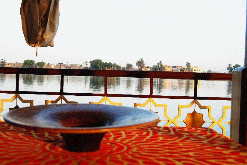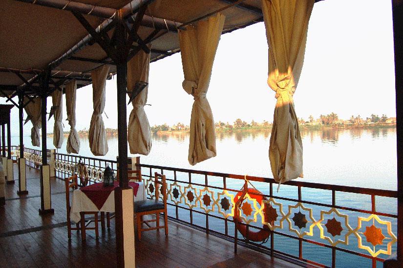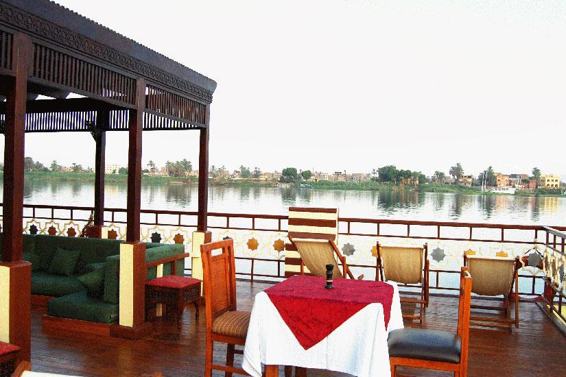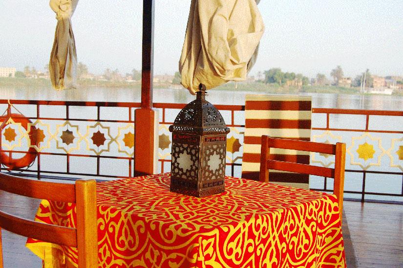 Breakfast is a leisurely affair which may be taken on the top deck whenever you are ready in the morning. There are no set times and the stewards will bring you freshly squeezed juice, fresh fruit, fine coffee and a variety tea’s, eggs any way you like them, even soft boiled eggs and soldiers as well as the usual cereals etc. Or you may prefer to try an Egyptian breakfast “Shak Shuka” eggs scrambled with onion, peppers, garlic and a little chili served with soft bread rolls to awaken your palate!