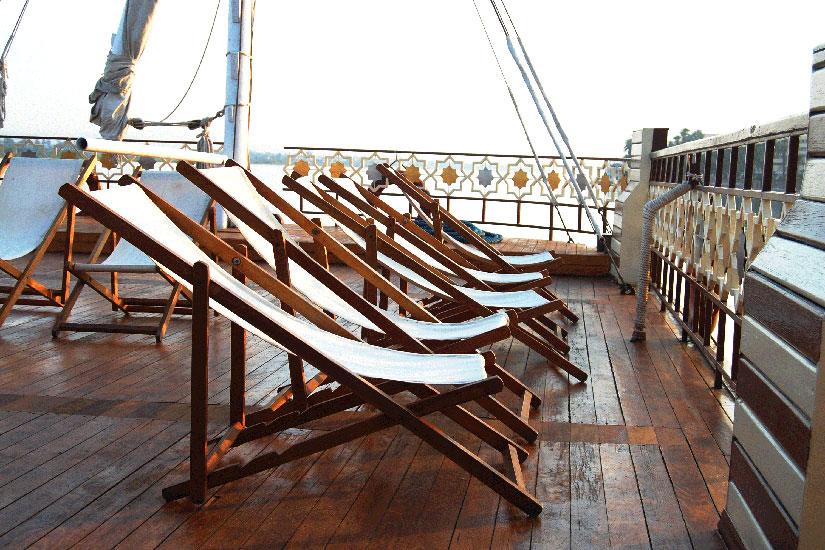 The Upper Deck is the place to be for sun worshipers with sun beds and cool down shower. It has oriental seating, sun Lounger, two Pergolas decorated with Arabic style, one of them has a big bar serving Fresh juices and alcoholic, However, Sundeck is for guests wanting to escape the heat of the sun it is partially shaded. We will take meals at our large banqueting table and relax on the comfortable deck furniture, or sip mint tea in our Arabic corner furnished with local carpets and cushions as well as Arabesque sofas.